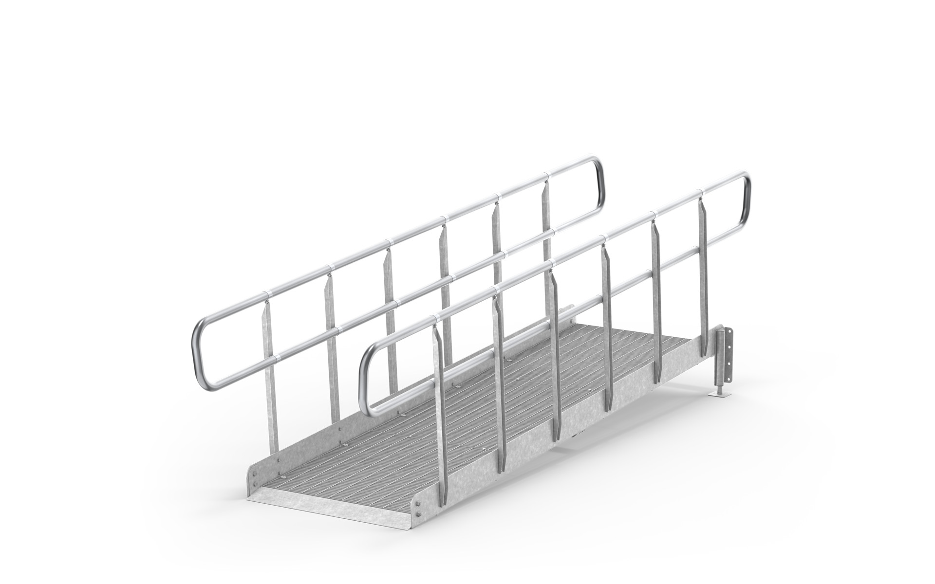 Våre komplette ramper produseres av gitterrister og inkluderer rekkverk, vangestykker og nødvendige støtteben. De har en enkel og robust konstruksjon i varmforsinket stål som bidrar til stabilitet og lang levetid. Med lagerførte standardkomponenter garanterer vi korte leveringstider. Vi har også et stort lagerført sortiment av rullestolramper med bredde 1300 mm for rask levering.