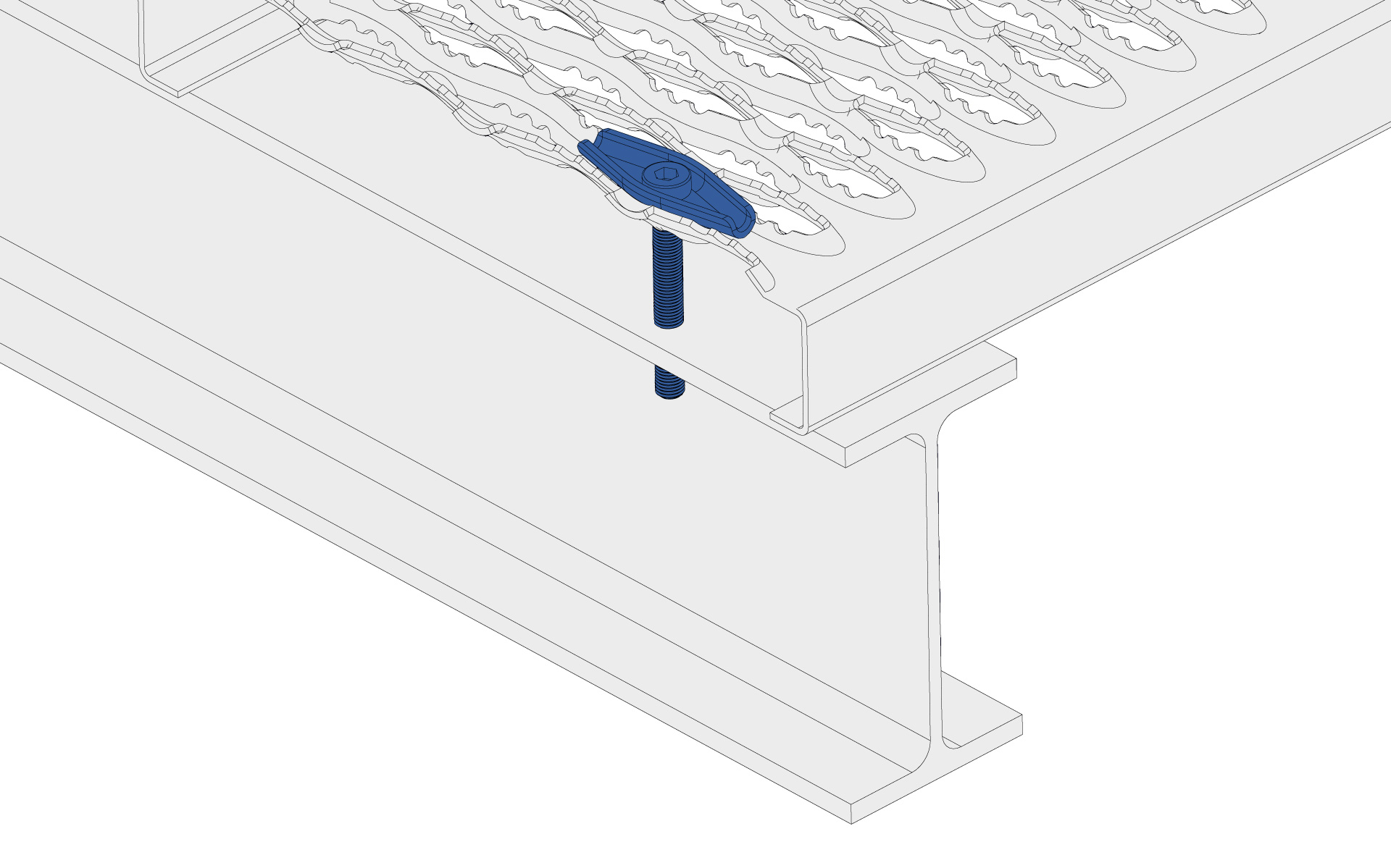 Komplett klammer i tre deler for feste av profilrister. Overdel, skrue (M8) og mutter. Finnes med skruelengdene 70 og 100 mm. Varmforsinket overdel. Skrue og mutter er i rustfri utførelse. Det må bores hull i bjelkelaget. Lagerført.