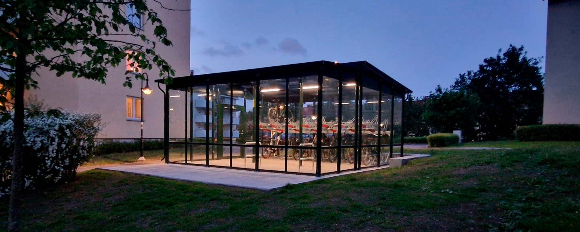Valget falt på Weland og et sykkelgarasje med glassfelt både øverst og nederst, med sykkelstativer i to etasjer. Glasskonstruksjonen ble nøkkelen til at garasjen smelter naturlig inn i omgivelsene. Med hjelp fra borettslagets gartner ble det også skapt et trivelig uteområde rundt bygget.