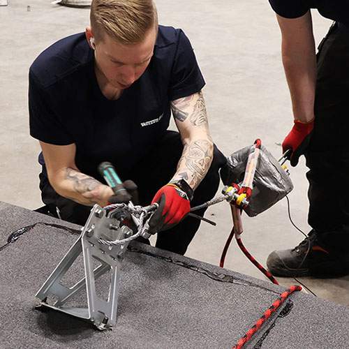 Testing i henhold til EN 17235:2024 for wiresystemer er en av de mest krevende seriene i bransjen og består av fire påfølgende dynamiske falltester med en fallvekt på 100 kg, hvor belastningen økes etter hver test. Dette stiller svært høye krav til energiabsorbering, innfestninger og systemets generelle robusthet.